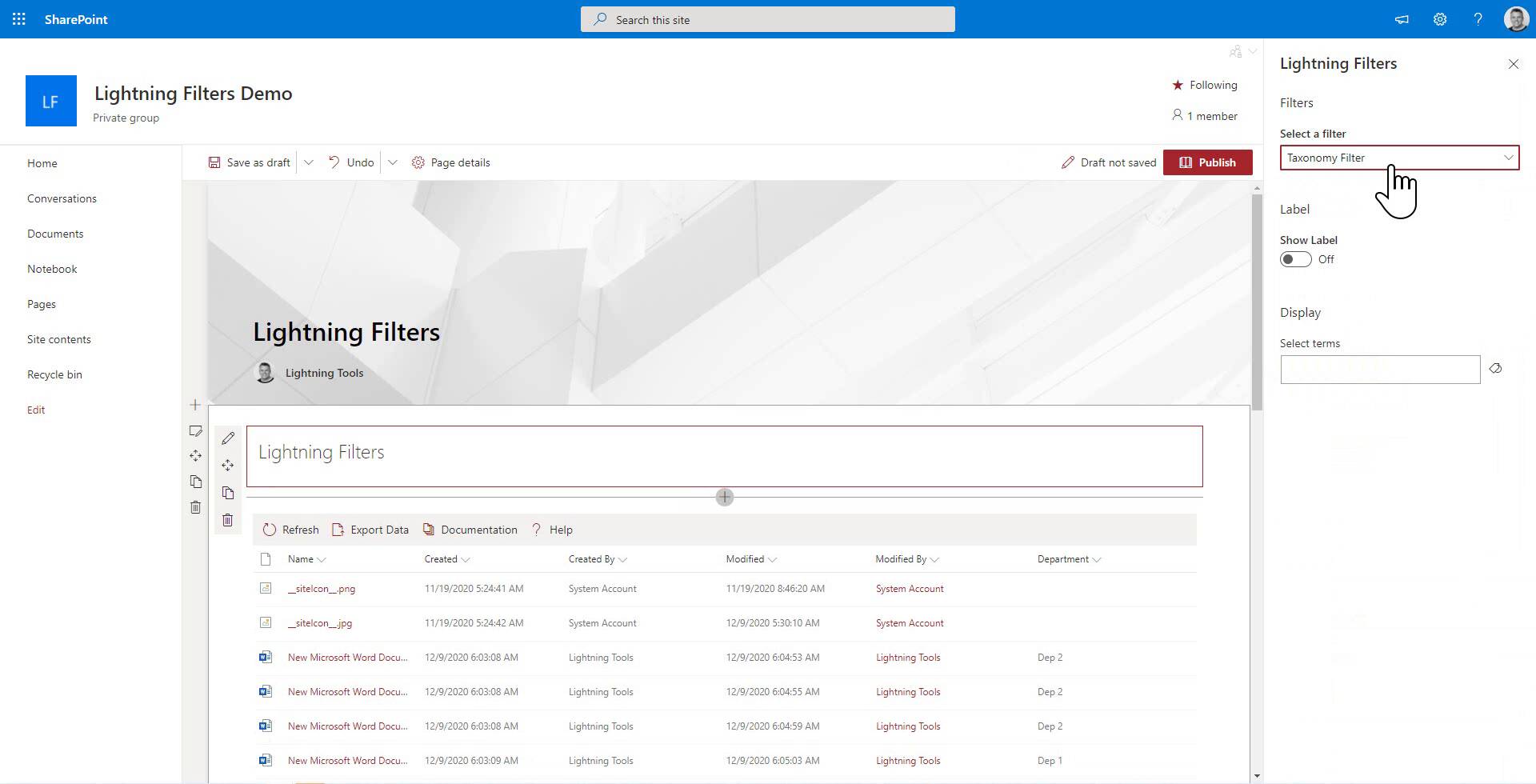 In this video, we’ll take a look at how to configure filters using the term store. We’ll configure Lightning Filters to provide a connection to the Lightning Conductor. The user will be able to select at least one term from the term store that they wish to use in order to filter the results of aggregated content from a document library with a managed metadata column.